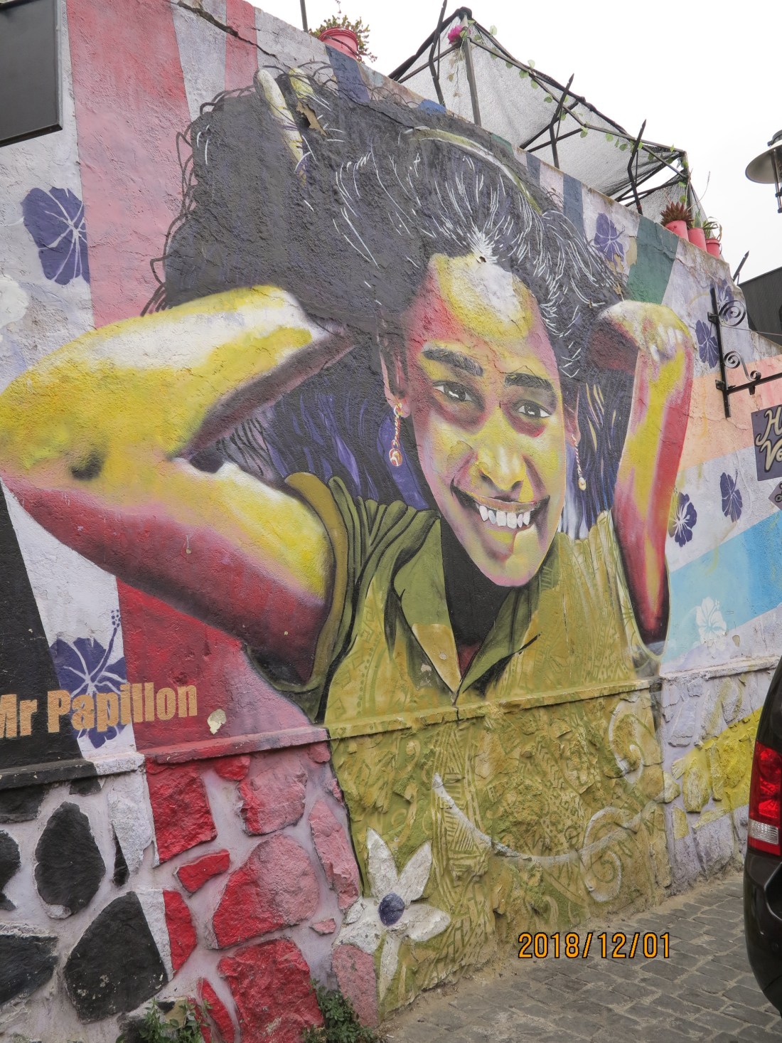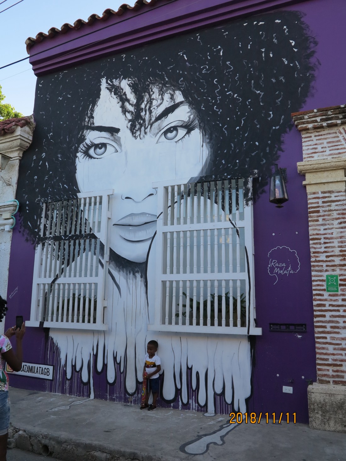Ett överflöd av gatukonst har vi däremot hittat både i brasilianska Paraty, i colombianska Cartagena och i chilenska Valparaiso. Här, i Valparaiso där vi befinner oss just nu, exploderar en hel stadsdel i färg och bild. Den heter ‘lyckliga kullen’ och dit söker sig en ström av människor för att se konsten och besöka många konsthantverksbutiker och restauranger. Här finns motiv av många olika slag, de som kommunicerar att huset innehåller en järnhandel eller restaurang eller de rent konstnärliga som också tolereras och finns kvar länge. Här finns också frustration och politik, kanske mer än vad vi två björkruskor riktigt förstår. Det vi ännu inte sett är religiösa budskap – inga moderna helgon på kyrkfasaden som pratar med gud!