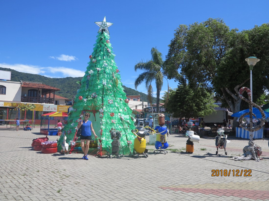 I alla länder som vi besökt har vi sett någon from av kommunikation om att ‘recycla’, hålla rent eller tänka på miljön. Den fulaste julgranen vi hittade (här i byn Lagoa de Conceicao) är gjord av tillplattade gröna PET-flaskor, så kreativitet saknas inte. Vi har åkt ganska mycket lokal- eller långfärdsbuss och irriterat oss över att bussens motor ofta står på även när bussen står still länge. Å andra sidan innebär det att AC’n fungerar och det har vi ofta varit enormt tacksamma över. Under stundom har vi varit dödströtta på kött och potatis, men faktum är att vi hittat vegetariska restauranger både i Chile, Argentina och Brasilien.