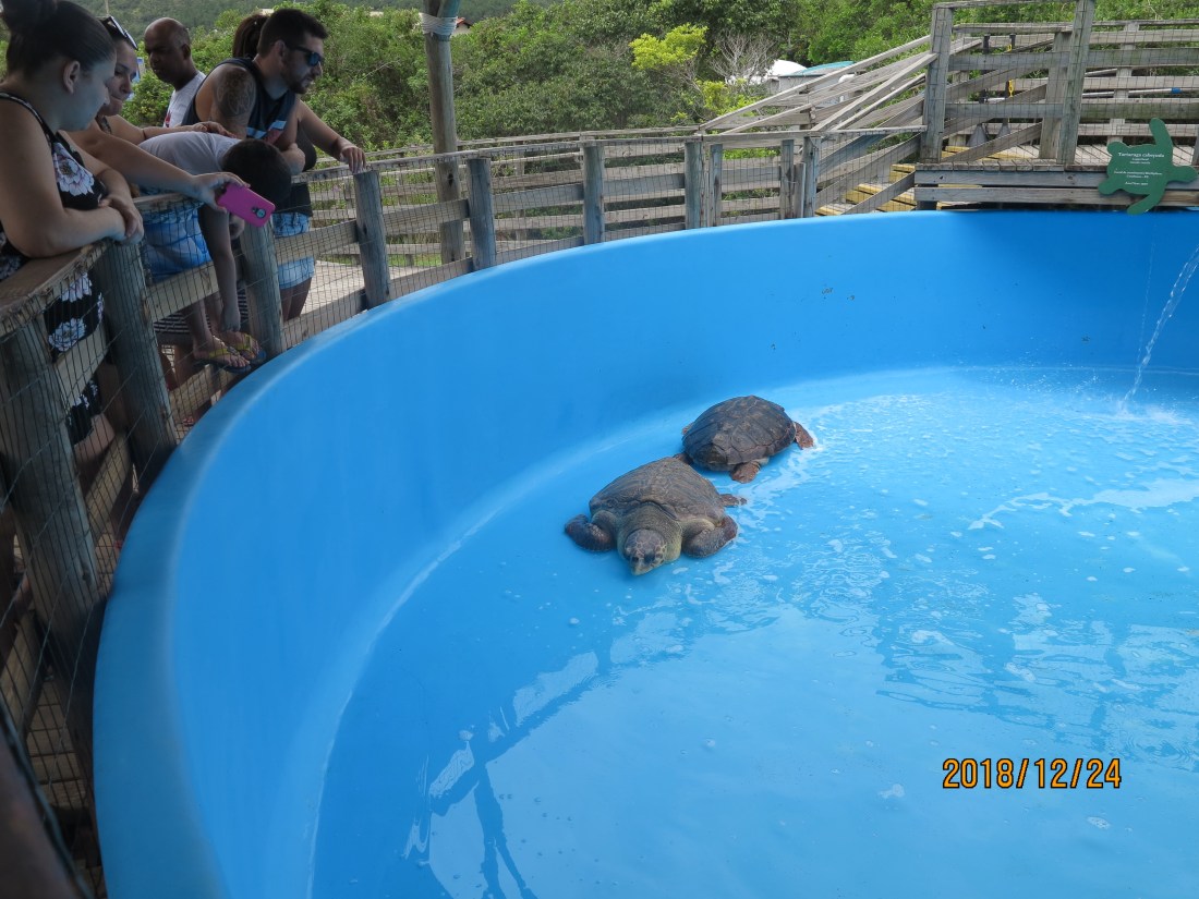 Här på ön har vi besökt ett sköldpaddscenter. De forskar om dessa märkliga urtidsdjur, räddar skadade sköldpaddor och har en liten utställningspark där man får besöka dem. Fler liknande center finns längs hela Brasiliens kust. I början av 1980-talet var de flesta sködpaddsarterna väldigt reducerade och hotade – nu är situationen betydligt förbättrad. Ett annat djur som vi sett mycket av på denna kontinent är hunden. I 90 procent av fallen har de sprungit runt helt fritt. Alltid (hittills) vänskapliga och ofta sovande sådär fullständigt utslagna på en varm trottoar som bara hundar kan. Små och stora människor verkar inte rädda, de verkar vana vid dem. Några samlar in pengar till dem och ofta visar det sig finnas ett system där de tas in på kontroller, steriliseras och vaccineras.
